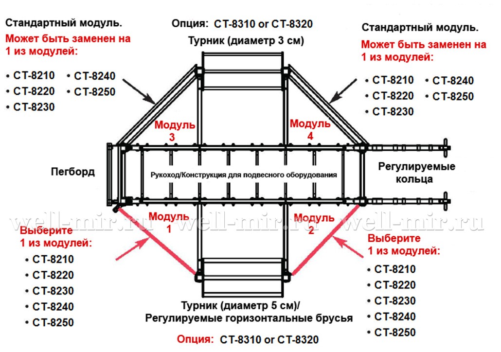 - Рама включает в свою комплектацию пегборд с реактором для медболов – деревянный перфорированный щит для подтягиваний на штифтах, регулируемые кольца, которые позволяют развивать выносливость, а также турник для подтягиваний, рукоход и параллельные брусья. Кроме того, рама включает в себя тонкий турник для подтягиваний, горизонтальные регулируемые брусья и два стандартных модуля, в качестве дополнения к которым можно использовать модули СТ-8210/8220/8230/8240/8250.
